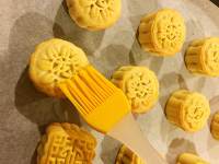 5分钟后拿出来,表面刷蛋黄液,蛋黄液可加入3-4滴水稀释一下。 一定要少量,可多次涂抹。只需涂抹月饼上层表面,侧面不需要。 (注意:用刷子沾取蛋黄液要先在碗边磕掉/摸掉多余的蛋液,一点点涂抹月饼上层表面,这样花纹烤出来才清晰);