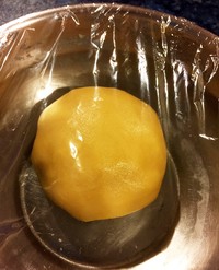 上手揉成不粘手的面团,因为加油的原因,不用揉很久就可以有图片中光滑的面团,放盆里静置一会,盖保鲜膜备用; (注意:由于蛋液量不好衡量,如果面团过粘,再一点点加面粉;如果过干不成团,可加点蛋液和油)