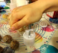 面团入模,使劲按压,左手最好扶稳或按压住模具。如果花纹不理想,可以再揉圆进行按花的工作;