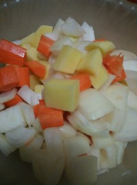 将土豆,红萝卜,洋葱洗净去皮,切小块。用紫色洋葱是为了搭配颜色,增加食物的色相,这次是白色的洋葱。