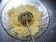 将蒸好的土豆放入碗中,用压土豆泥器压成土豆泥,直到没有颗粒
