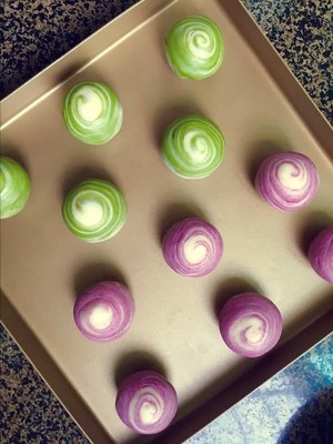 把油酥部分混合均匀后分成两等份,分别加入抹茶粉和紫薯粉用小刮刀翻拌均匀盖上保鲜膜醒发20分钟