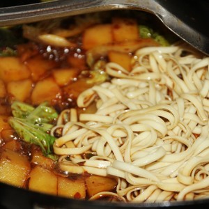 待炒菜锅内剩少许汤汁时入面条炖煮。