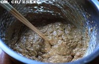 将面粉和红糖水,用筷子打匀,并将清洗过的枣片加进去
