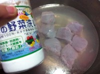 里脊肉切大块,用贝壳粉浸泡半小时(给宝宝吃的所有东西我都习惯用贝壳粉泡下)