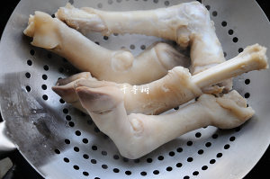 Tip:1.羊蹄的骨头超级硬,用厨房里的菜刀羊蹄砍骨头有点勉为其难,大家买羊蹄的时候可以请卖羊蹄的老板用他们的电锯给处理成小块状。 2.其实高压锅压出来后,羊蹄基本上就脱骨了,完全可以把长点的骨头捡出来,再把脱骨的羊蹄切成小点的块儿。