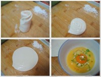 锅内少许油,小火微热时,加入擀好的饼片。略煎一会儿,翻面。待饼身微微鼓起时,用筷子挑破,即在饼表面豁一个口,倒入蛋液,继续煎10几秒,翻面再煎10秒即可;(我灌进去一半,另一半盖外面了,哈哈)