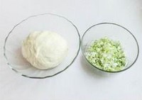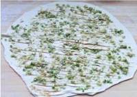 在面皮上撒一层薄薄的腌过的葱花,均匀地撒满