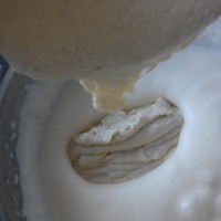 打发蛋白至硬性发泡,即提起打蛋器头蛋白拉出直立小尖。分两次加入蛋黄,继续打发。