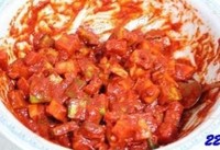 将大蒜,姜,洋葱切碎,加入在辣椒糊中,(也可以用搅拌机打碎)