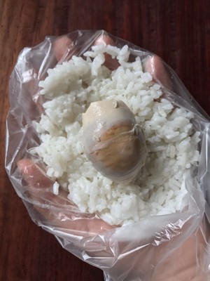 煮好的饭一大碗(稍软点的米饭比较容易造型),放至温热;用保鲜袋装一团,勺子压平;放上蛋黄,再舀一团饭盖住蛋黄,轻轻捏合;