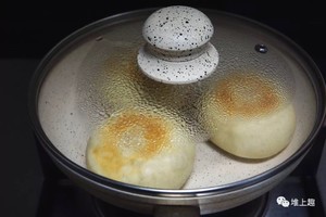 取平底锅,将小圆饼芝麻面朝下放入锅中,盖上锅盖小火烙五分钟,再翻面烙五分钟,即可出锅。