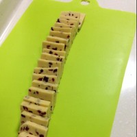 冻硬的面团从模具中取出,切成厚薄均匀的片,冻的硬一点会比较好切噢