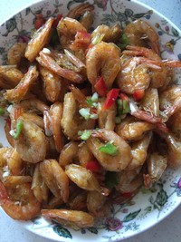 起锅前要把切成小的青红椒和葱白小段铺在盘子地下把炸好的虾捞起来倒在盘子里!趁热撒上椒盐!翻拌虾子让椒盐更均匀!