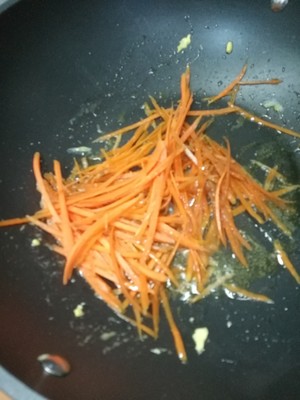 留底油放胡萝卜丝翻炒片刻,盛出备用(这一步要看你的胡萝卜丝有多细,为了成品好看我盛出来了,炒太久就会太软)