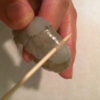 用牙签从虾身的倒数第一节与倒数第二节中间穿过,然后向上抽取虾线