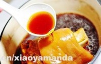 此时候蹄髈已经基本软烂了,此时捞出锅里的香料等所有杂物,并且转移出一半的汤汁不用,在剩下的汤汁里倒入生抽