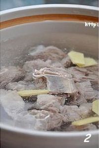 生姜刷干净,去皮,切片。将生姜皮和排骨一起下入清水锅中,煮开后继续煮三四分钟,将排骨捞起沥干,水和姜皮就倒掉不用了