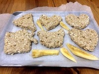 Tip:1、因为现在的香蕉都比较硬,就算表皮烂了结果里面还是生生的赶脚,不过还好剁很烂也没事不影响口感。 2、要弄薄点,烤久点才会香香脆脆的,不过要观察,防止烤糊掉。 3、在毡板上定好型,用刀平铲至烤盘。