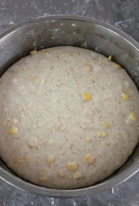 先将高筋面粉和水搅拌成团加入盐和天然酵种搅拌至表面光滑有弹性加入玉米粒,搅拌至拉开面膜即可。放到盆子里以温度室温发酵4个小时,每40分钟至60分钟,将面团对折滚圆,一共4次左右就可以了(因为面团很软,每发酵40分钟左右,就会瘫平,所以需要没40分钟至60分钟左右对折滚圆一次)发酵至面团比原来大2倍左右。需要冷藏过夜发酵也可以