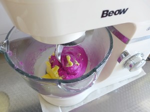 将高筋粉、砂糖、盐、酵母放入厨师机搅拌杯,将火龙果果泥、淡奶油混合在一起备用;