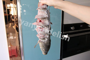 鱼身两面剃花刀,直刀走,平刀进,翻出来,划一刀,注意不要切断。