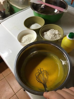 蛋白打好加三分之一跟蛋黄糊搅拌均匀 不能划圈 否则会消泡 导致发不起来了这个时候 电饭锅开始按煮饭键预热锅