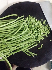 新鲜豆角,晾晒一天,晾干水分,去头洗净切小段。切忌不沾油。