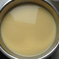 在牛奶里倒入鸡蛋,并且用打蛋器搅拌均匀,就是布丁液了。