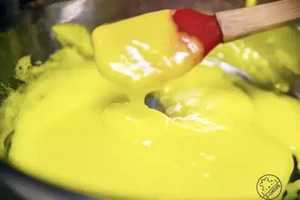 将混合物倒回汤锅中,开中火,不停搅拌至沸腾。沸腾后继续加热搅拌1-2分钟,直至变的如同蛋黄酱一样浓稠的状态。