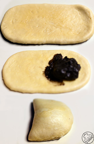 将面团中的气体排出,包入奶油酱,捏紧收口处,蒙上保鲜膜,进行最后发酵40-60分钟,至两倍大小。