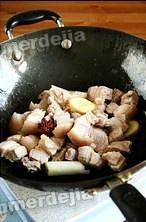 锅中油热后,放入葱姜、花椒、八角煸香,放入飞水后的五花肉翻炒均匀,加入料酒烹香、老抽上色