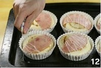 Tip:1、如果没有面包纸托,也可以把切好的面团直接放在烤盘上。 2、火腿上为什么有小黑点?是黑胡椒哈。