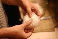 手上沾盐水,米饭摊平挖个小洞,吻仔鱼放进去,再抓一点米饭盖上捏成饭团。