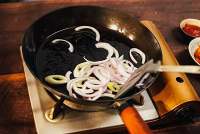 锅中热油,放入洋葱丝、大葱花炒出香味后,放入辣白菜炒匀。