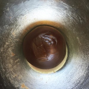 依次把好时巧克力酱和花生油秤好重量倒入操作盆搅拌均匀,然后加入过筛后的面粉和可可粉,用硅胶铲慢慢搅拌均匀。