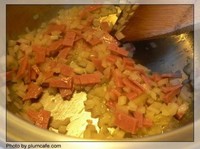准备材料:洗净的菠菜叶一束,切丝。西式火腿改刀切成小片,洋葱小丁,剩米饭2小碗,盐和黑胡椒粉各适量,芝士粉2大匙,炒菜油1大匙。锅热油,炒软洋葱丁。倒入火腿小片,炒匀