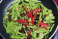芦蒿切段、红椒切丝、蒜切片、蒸好的腊肉切片