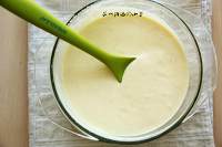 奶油奶酪室温软化后,用合适的工具将其和砂糖一起碾至无明显块状的均匀状态。之前的乳酪蛋糕我一直用打蛋器低速搅打,但是搅打很容易卷进过多的空气,烘烤式乳酪蛋糕不需要太多空气。如果有均质机也可以用机器将其搅拌均匀。切记此步骤尽量快,否则砂糖容易吸收乳酪中的水,很容易形成很多小颗粒。随后加入淡奶油和酸奶搅拌均匀。然后鸡蛋一个一个加入搅拌均匀。搅拌好的乳酪糊通过万能晒过滤,剩余的颗粒状可用硅胶铲将其碾碎,过滤出去。最后乳酪糊状态如下图: