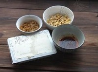 干黄豆泡一碗上。榨菜切碎,姜切末,小碗里先放上:油辣椒、酱油少许、花椒末、姜末、芝麻油、味精、盐少许