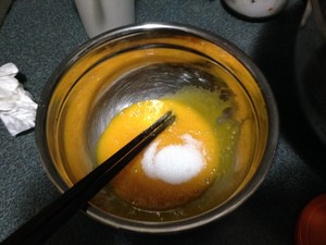 蛋黄里加入1/3的白糖,橄榄油打散!