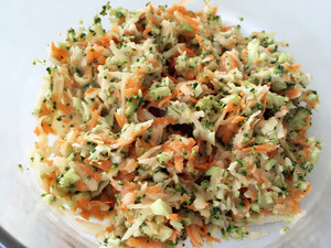 把西兰花颗粒、土豆细丝、胡萝卜细丝混合放进一个碗里。
