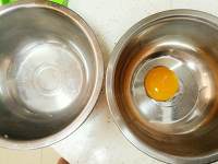 将鸡蛋的蛋清和蛋黄分离,注意蛋清里面一定不能有蛋黄,要不然蛋清不好打发
