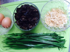 发酵期间准备馅:韭菜洗净,木耳泡发(热水泡发最快),鸡蛋和虾皮