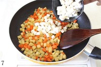 11.倒入炒好的土豆,胡萝卜,豆腐丁。