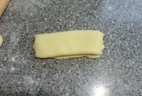 面团取出,撒手粉,擀成长方形,折三折,再放入塑料袋十分钟。十分钟后再重复一次这个步骤。