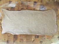 工作台撒手粉,将面团轻压擀成长方形,向四个角擀会更容易成长方形。