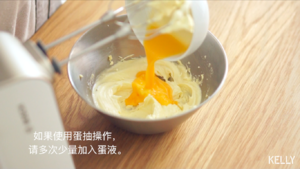 注意: 1.黄油务必软化到位,打蛋头可以轻松戳入即可,。 如果来不及软化,可以微波加热,每10秒取出直到变软为止。 2.此配方可使用手动打蛋器操作, 分3-4次加入鸡蛋,搅拌至完全融合即可。 3.如果使用生杏仁,请提前烤熟。 黄油低速打散。