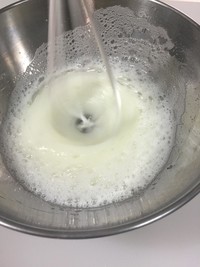 制作蛋白霜:先用电动打蛋器中速将蛋白打出泡沫来,加入20克细砂糖。