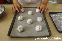 用一个冰激凌把冷藏好的面糊挖成小圆球放到糖粉中均匀的裹上糖粉后放在小托盘上再重新放回到冰箱冷藏20-30分钟。